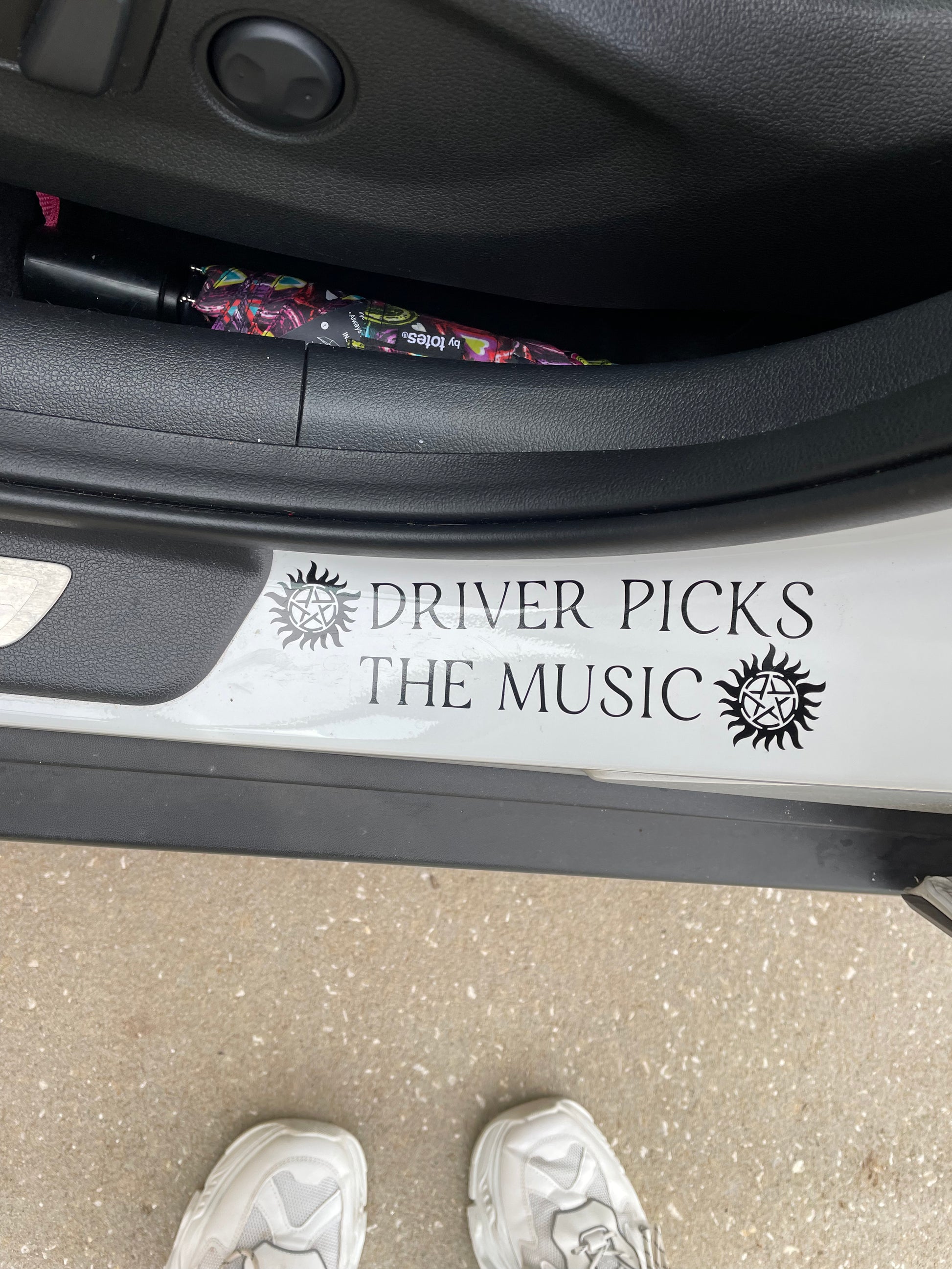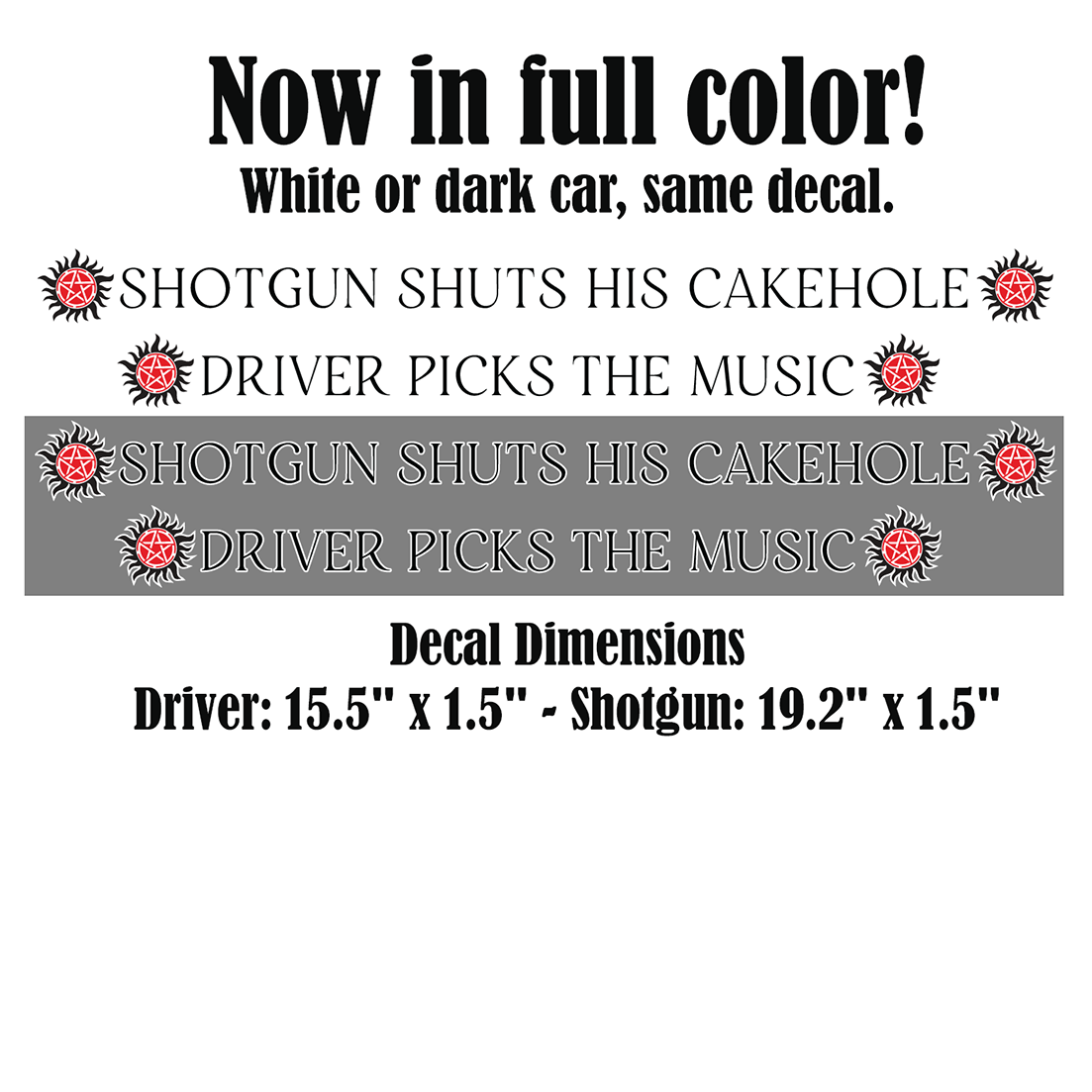 Show off your fandom with this Driver Picks the Music, Shotgun Shuts his Cakehole car decal from the classic Supernatural TV show featuring Dean Winchester and his 1967 Impala!