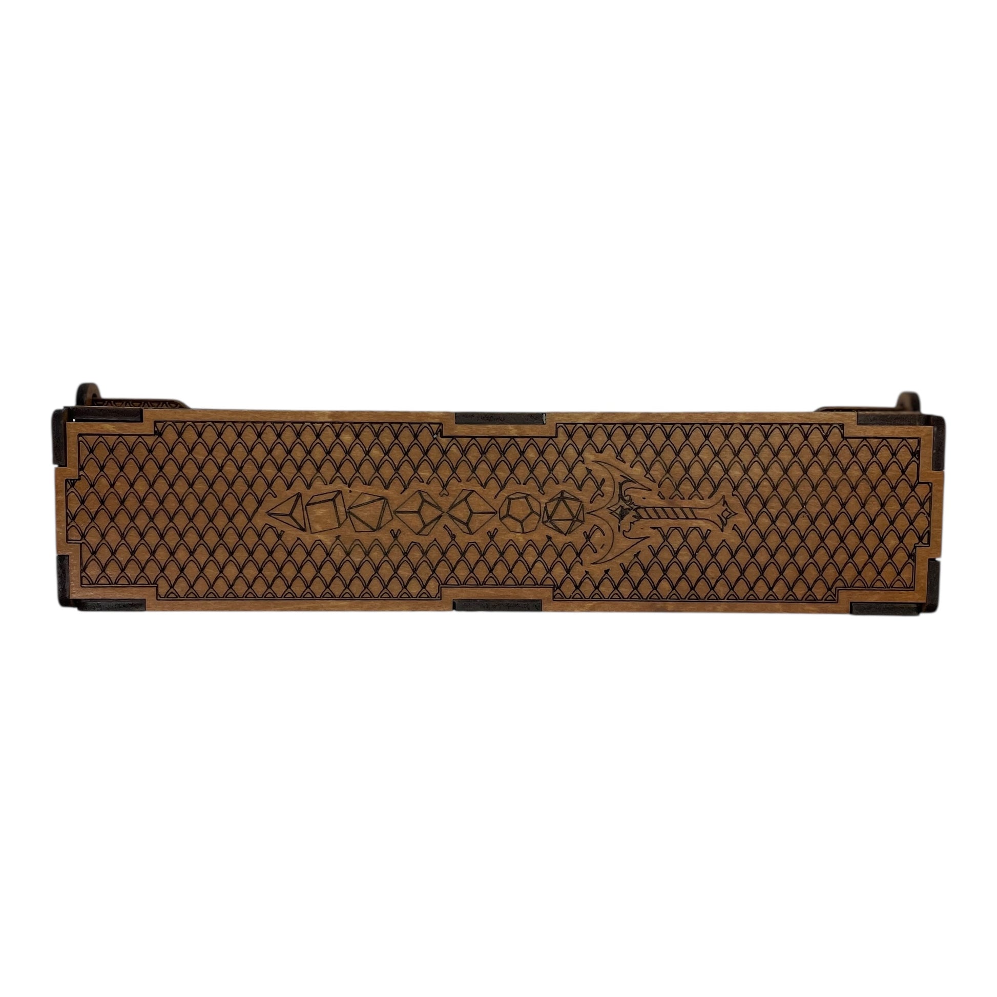 Made from 3mm basswood plywood, this box is laser cut and engraved with intricate detail, then hand-stained and varnished for a rich, finished look. Hidden magnets securely hold the lid in place—so your dice stay safe whether you're traveling to your next campaign or storing them at home.
